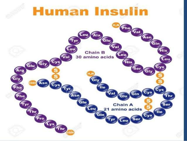 Insulin is a double chain of 51 amino acids. Its antidiabetic property comes from the exact sequence, number and type of amino acids contained in these two chains. If any single amino acid is changed or even misplaced, that person will have no insulin. He will need insulin injections life long. He will die if he misses one single dose. He is what we call the type 1 or Insulin Dependent Diabetic. ( IDDM)