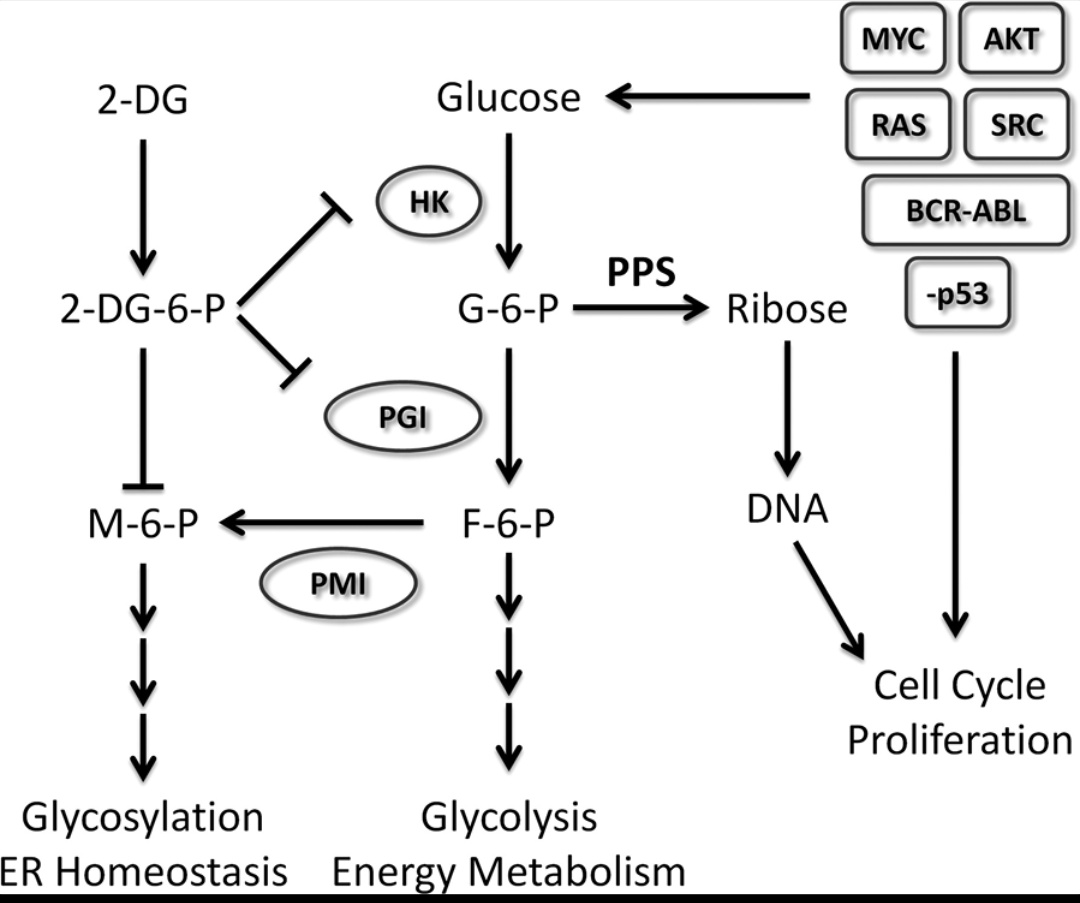 ( 2-DG exploits a universal trait of cells in which the upregulation of glucose uptake and metabolism has started. For example, it supports uncontrolled proliferation by providing the nucleotide building blocks via the PPS, reprograms energy metabolism by aerobic glycolysis, and maintains ER homeostasis through proper glycosylation, and so forth. By mimicking glucose, 2-DG offers a natural means of exploiting increased glucose metabolism. However, as under norm-oxia other energy sources can be used to fuel cells and sustain their viability, 2-DG’s toxicity is more limited to cells under hypoxia. Although under norm-oxia most tumor cells are growth inhibited by 2-DG treatment, we as well as others have found that a select number of tumor cell types in this environmental condition undergo ER stress-induced cell death. Therefore, 2-DG holds much promise for treating most if not all cancer types. Oncogenic events are indicated by rectangles and metabolic enzymes by circles. )