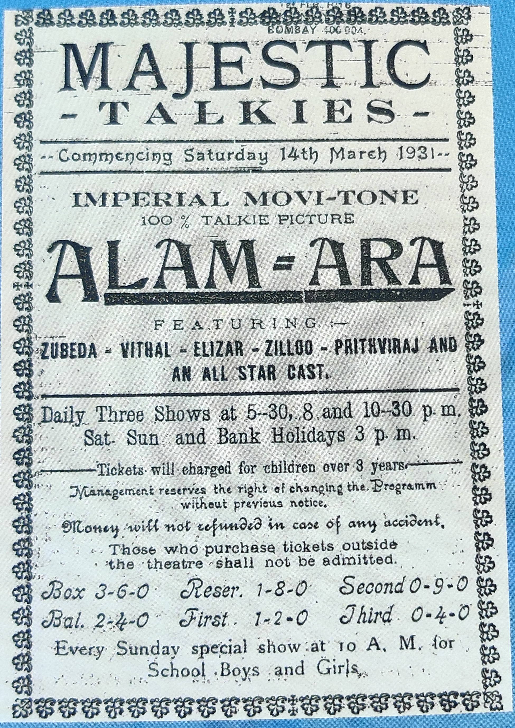 In those days a regular ticket costed 4 Anna. It was sold at 10 times of normal rate in black. Prithviraj Kapoor played villa in the movie