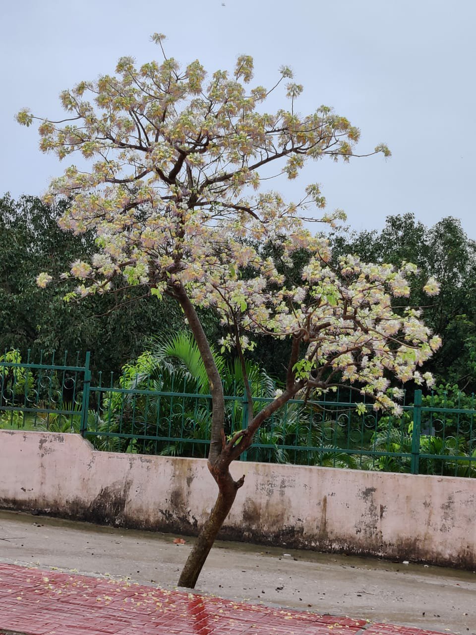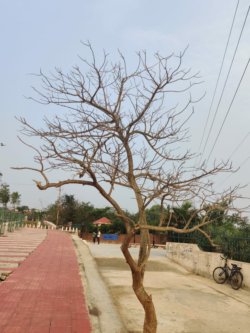 One fine morning, in the summer, I was surprised to find that the tree had gone completely bald. Not a single leave was to be seen.(pic-1) The masons of the park construction had started putting ceramic tiles around it. I thought the tree had died due to chemicals. I was so unhappy. Then rains came and lo and behold, the tree was again bedecked with a luxurious canopy of green foliage (pic-2). As the autumn glided in, I found that all its leaves are gone. In its place there was a tree full of luxuriant flowers of brilliant hues.(pic-3) Then the winter came and here is another pic of the tree.(pic-4)