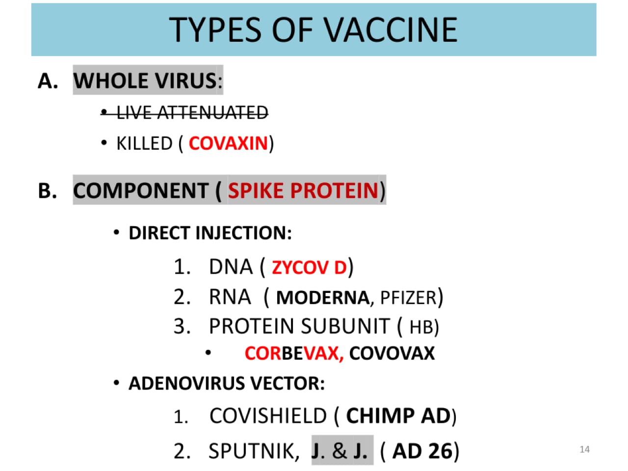 - Live Viral Vector ( contains a live Adeno virus: Covishield, CanSino, Gamaleya)