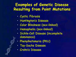 In the same way, if our genetic code is changed by a single letter, a completely different gene is created. sometimes it may be innocuous. But some times, it can create a life threatening disease. A list of diseases caused by one point mutation is given below.