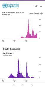 Here is the WHO graph for these two regions. The upper graph (red) shows weekly covid detection in Western pacific region. The bottom ( purple) records South east Asia detections. The base line records the years: starting with Dec 31 0f 2019, 2020,2021 in that order. It ends at Dec 2022