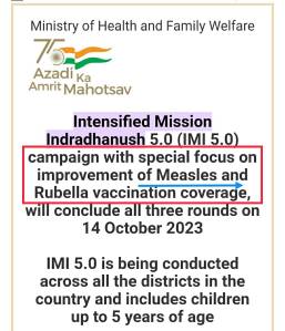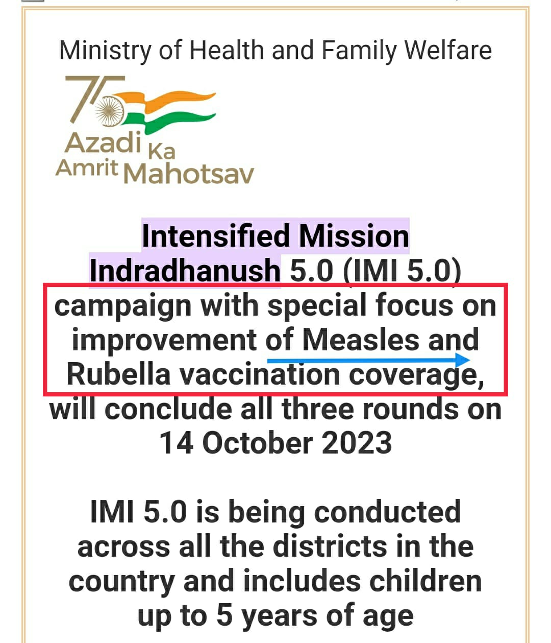 Since then Government of India has led a special drive of immunisation of children called Mission Indradhanush to vaccinate all children below 5 years. Recently Intensified mission Indradhanush 5.0 ( IMI 5.0) concluded on 14 October 2023.