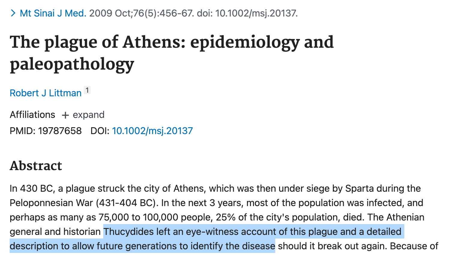 Thanks to Thucydides, the historian and a general of Pericles, we get an accurate, eye-witness and written record of the great plague.